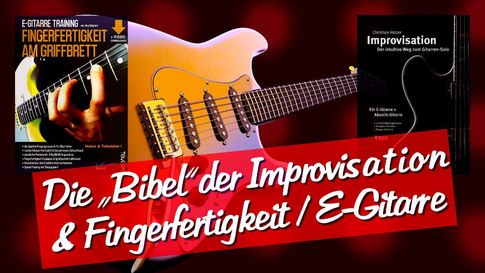 POWER-Training für fortgeschrittene E-Gitarristen: Entdecke die Bücher Improvisation - der intuitive Weg zum Gitarrensolo (Christian Holzer) & E-Gitarre Training - Fingerfertigkeit am Griffbrett (Jörg Sieghart = meine Wenigkeit) und erhalte beim Kauf dieser beiden Bücher in meinem Tunesday Shop am 25. oder 26. Dez. einen Rabatt-Code von 50.- € auf meinen umfangreichen Bluesgitarre-Kurs für Fortgeschrittene!