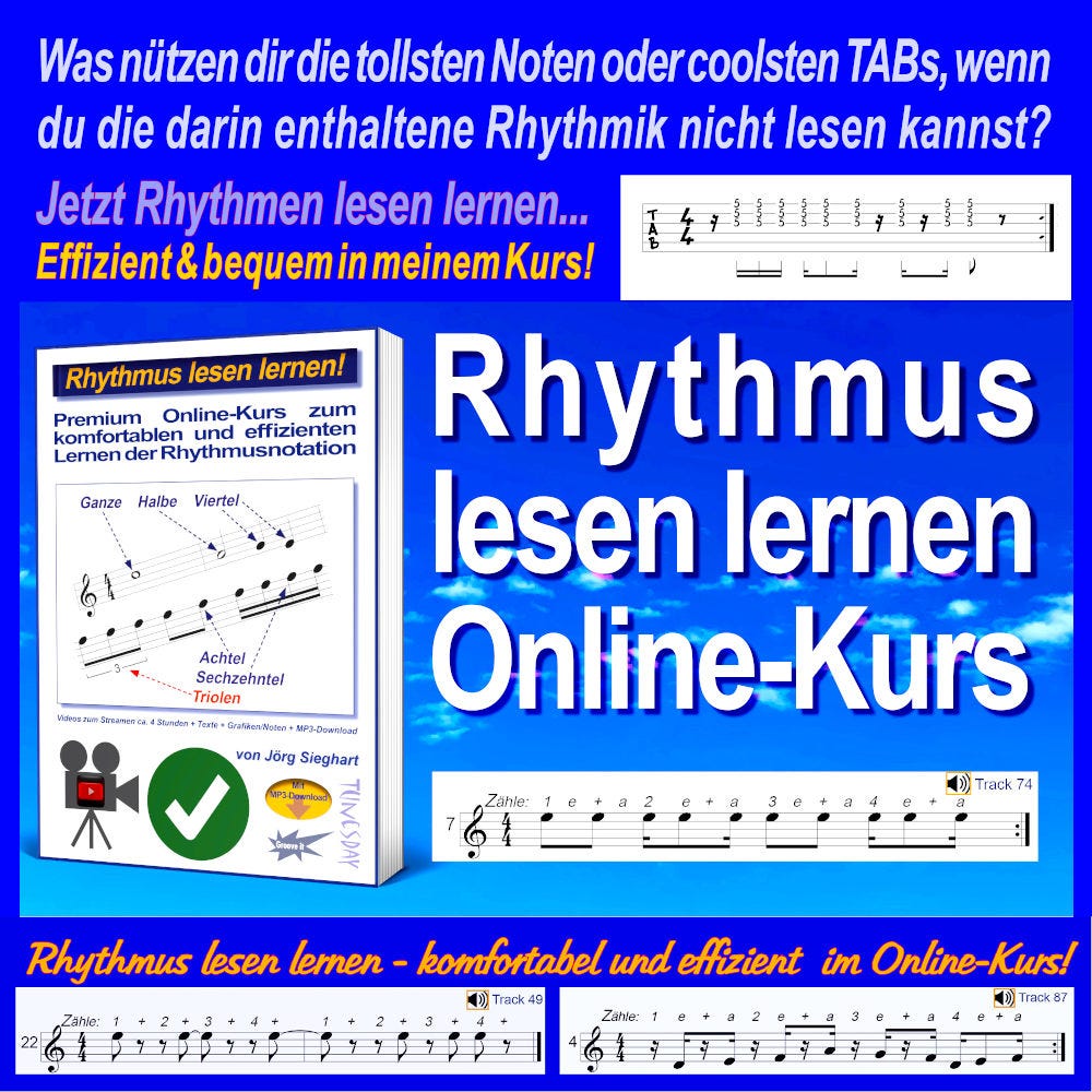 OHNE Rhythmus läuft nichts in der Musik und OHNE Rhythmus-Repertoire wird man nur einseitig spielen. So ein Rhythmus-Repertoire & Rhythmus-Fundament eignest du dir an über gezieltes Rhythmus-Training. Zudem erarbeitest du dir die Möglichkeit endlich unabhängig Rhythmen in Tabulatur und/oder herkömmlicher Notation lesen zu können. Denn was nützen die tollsten Noten oder coolsten TABS, wenn du den Rhythmus nicht lesen kannst?