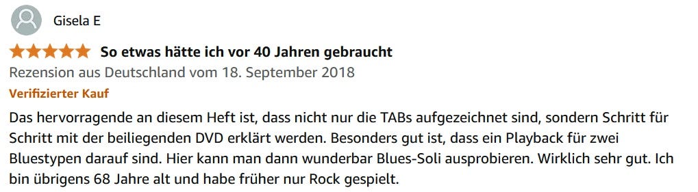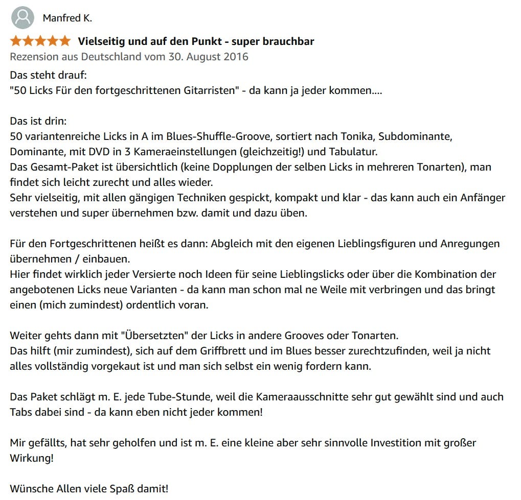 Da die 50 Videos meiner Lehr-DVD "50 Blues Licks" in diesem Kurs mit enthalten sind, möchte ich euch die bisherigen (öffentlich zugänglichen) Bewertungen eines großen Verkaufsportals dazu nicht vorenthalten! Nachfolgend eine kleine Auswahl...