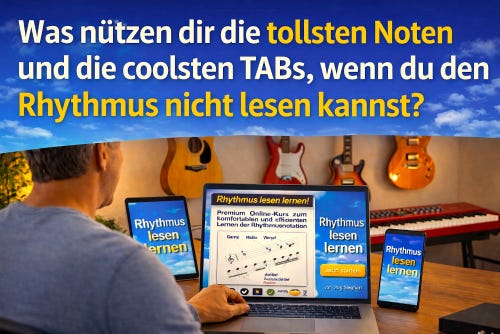 ✓ Wie wäre es, wenn du künftig alle Noten oder TABs rhythmisch ohne fremde Hilfe selbstständig lesen und dir auch unbekannte Stück so eigenständig erarbeiten könntest?